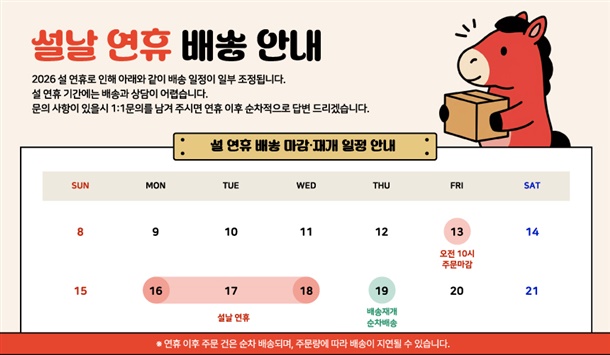 · 예약 발송 상품은 상품 상세 설명에 안내한 배송관련 정보를 반드시 확인 후 구매해 주세요.