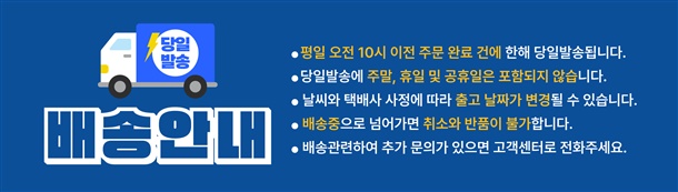 · 배송은 입금확인된 날짜로부터 1~3일 소요되며 최대 7일 이내 제공됩니다. ( 공휴일, 기상악화 등 불가피한 상황에 따라 추가 지연될 수 있습니다.)